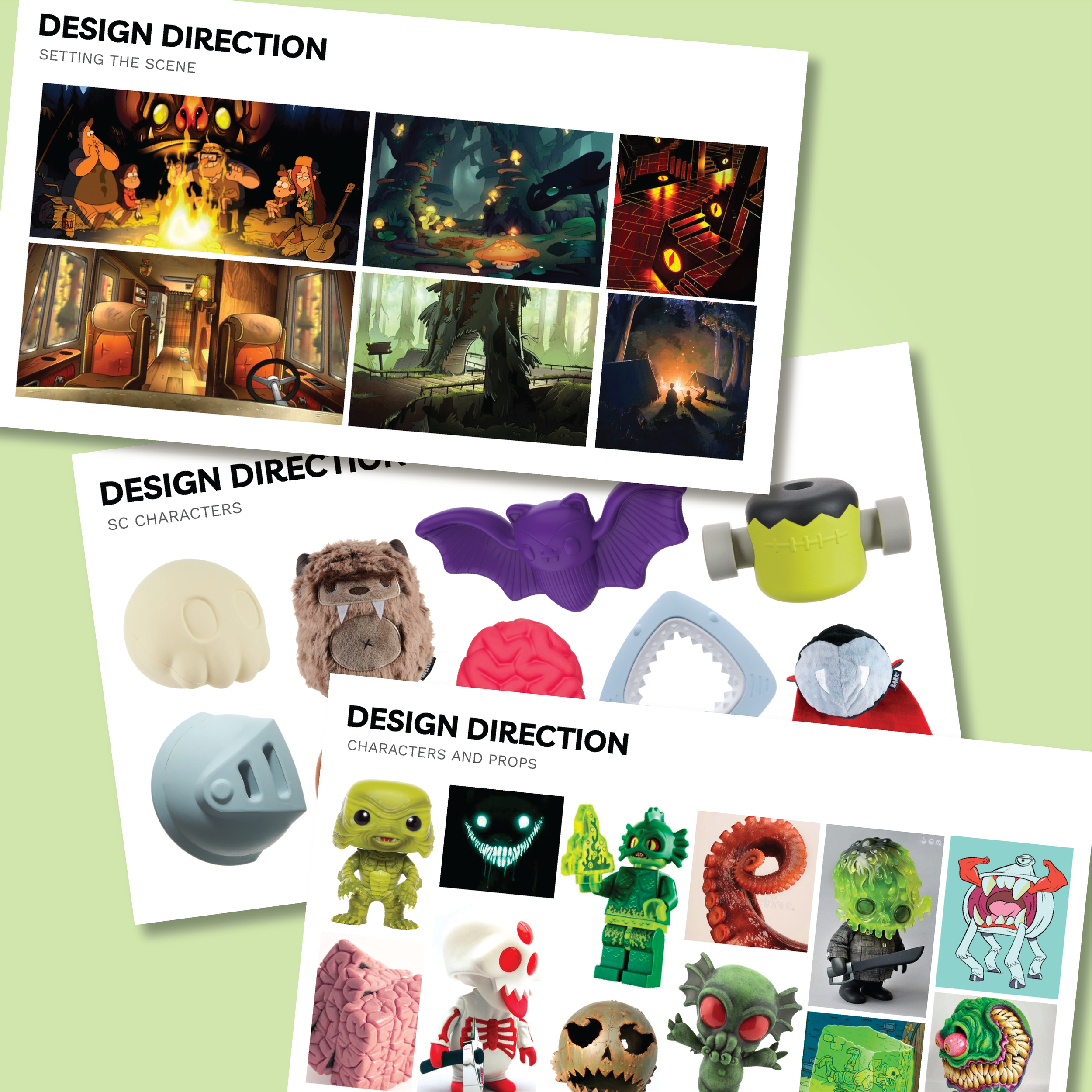 Each monthly box begins with a creative kickoff led by our Design Director and Art Director, who provide high-level moodboards and visual narratives. My role is to translate these broader stories into collection-specific design languages, developing working boards for our team that define textures, form factors, characters, and material suggestions.